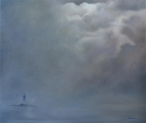 I experimented with a watercolor version of two geese migrating from Whaleback Lighthouse in the fog, but it wasn't until I moved to oils that I was able to capture the damp gloom of winter on the horizon. Working large also helped create the mood for the birds and the abandoned lighthouse. At 38"x40", this is my biggest painting yet.