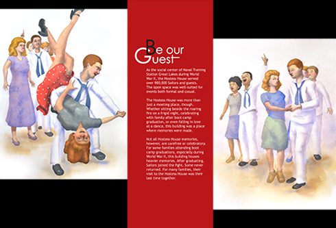 In my experience, illustrations always look better in context. Here is the end result of the watercolor illustrations for the Hostess House exhibit at the National Museum of the American Sailor.