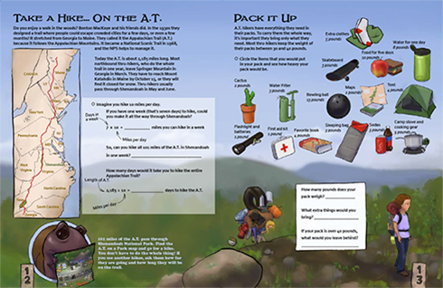 Here's another two-page spread from the Junior Ranger Book for Shenandoah National Park. This one is my favorite from the whole 20-page book. It was a real opportunity for creativity and fun. Who brings a tire on a hike?