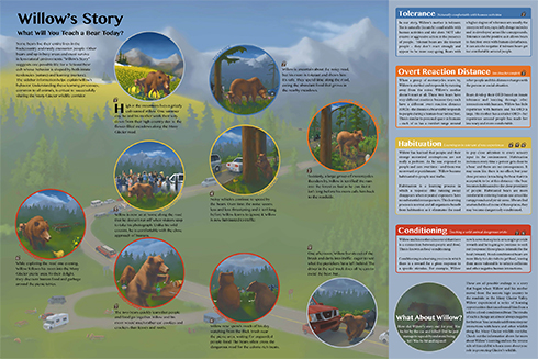 This wayside addresses the issue of wildlife safety by following a fictional bear who becomes habituated to human food. Through a narrative written by behavior and wildlife experts, “don’t feed the bears” is put into perspective in a unique and engaging way.